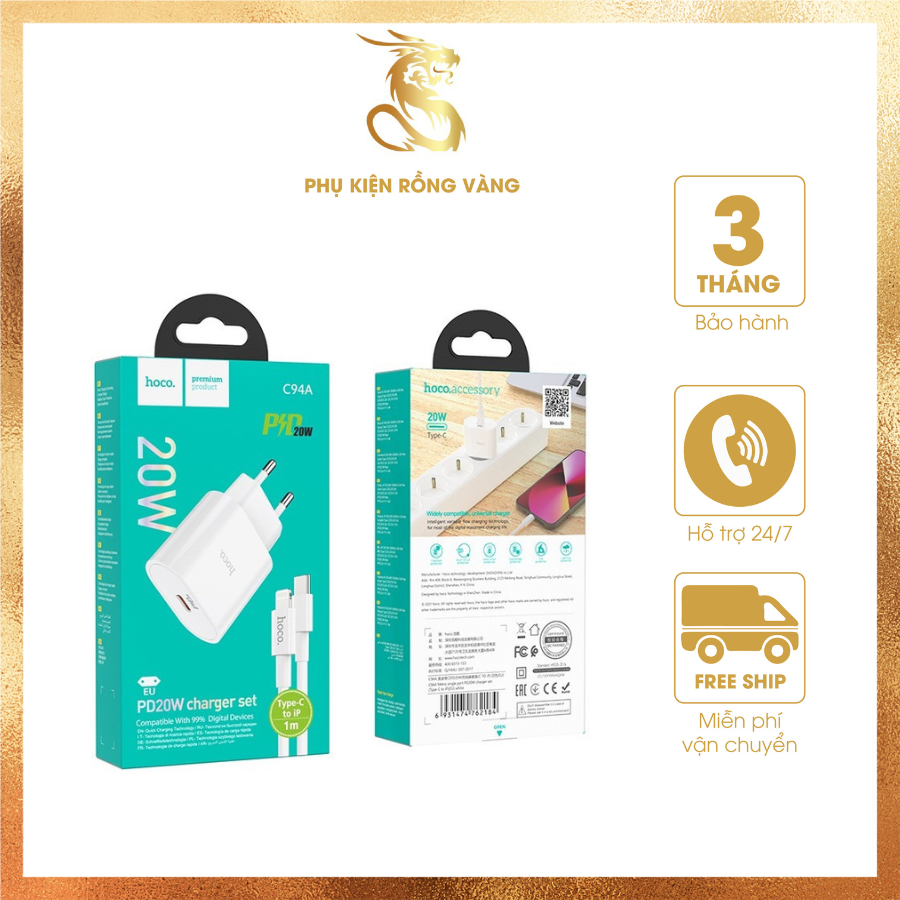 Là phiên bản bộ sạc nhanh đến từ Hoco, C94A nổi bật với kết cấu vô cùng nhỏ gọn và di động, khả năng hoàn thiện tốt đi kèm công nghệ sạc nhanh, hỗ trợ dòng sạc ổn định. Cụ thể, bộ sạc được trang bị chuẩn sạc nhanh PD3.0 với công suất lên đến 20W, giúp tăng tốc độ sạc để rút ngắn thời gian sạc hơn so với các loại cốc sạc 5W thông thường. Ngoài ra, cáp Type-C to Lightning đi kèm cũng sẽ là lựa chọn tuyệt vời đối với các dòng thiết bị iOS.