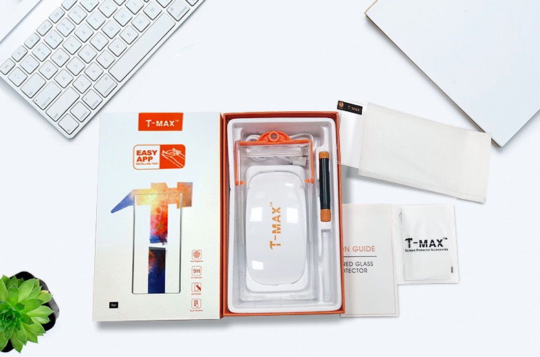 - Bộ sản phẩm nguyên box gồm có: 1 miếng cường lực T-Max + 1 lọ keo UV + 1 đèn UV cỡ lớn + Tặng kèm giấy lau khô, giấy lau ướt, miếng dính bụi.