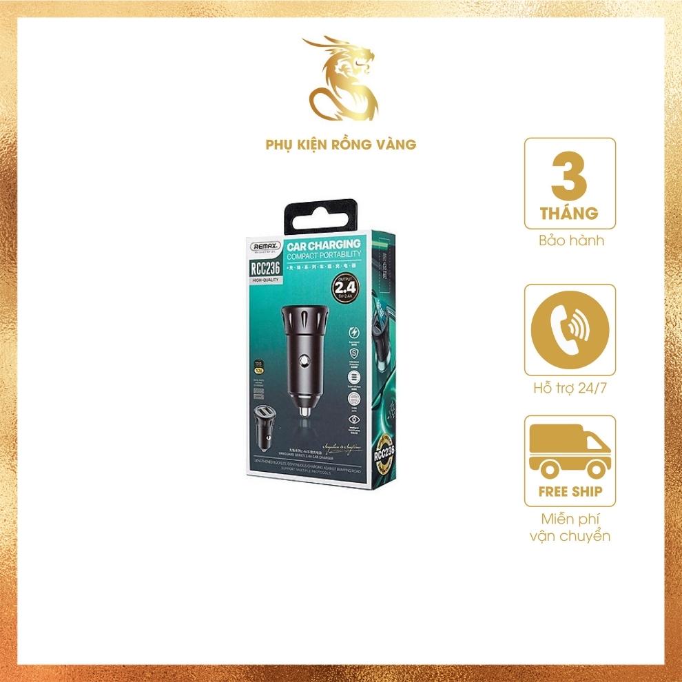 - Tẩu sạc ô tô Remax RCC-236 2.4A được sản xuất bởi thương hiệu Remax giúp người dùng sạc pin nhanh chóng, ổn định, đảm bảo an toàn cho người dùng và thiết bị.